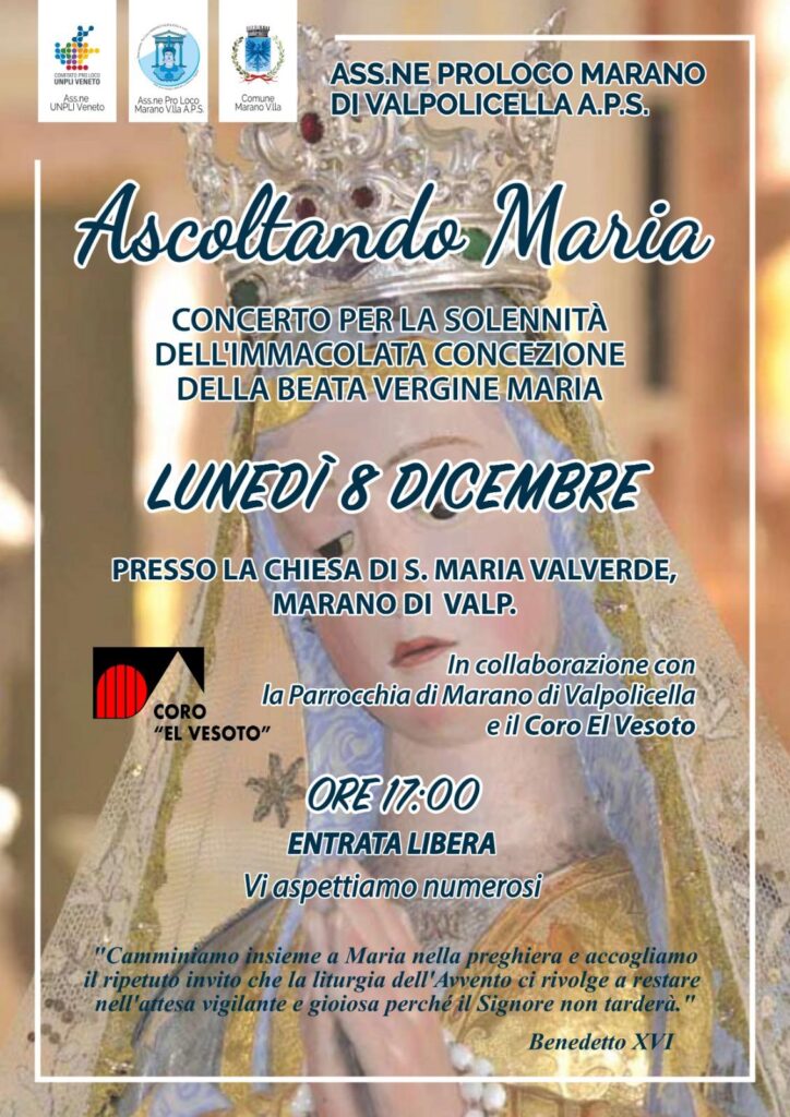 Lunedì 8 Dicembre alle ore 17.00, nella chiesa di Santa Maria Valverde terremo il concerto “Ascoltando Maria” L’ormai tradizionale concerto, con ingresso libero, sarà organizzato dalla ProLoco di Marano di Valpolicella per festeggiare la solennità dell’Immacolata concezione della Beata Vergine Maria. Con l’occasione sarà inaugurato il nuovo impianto di riscaldamento della chiesa. Prima del concerto, […]